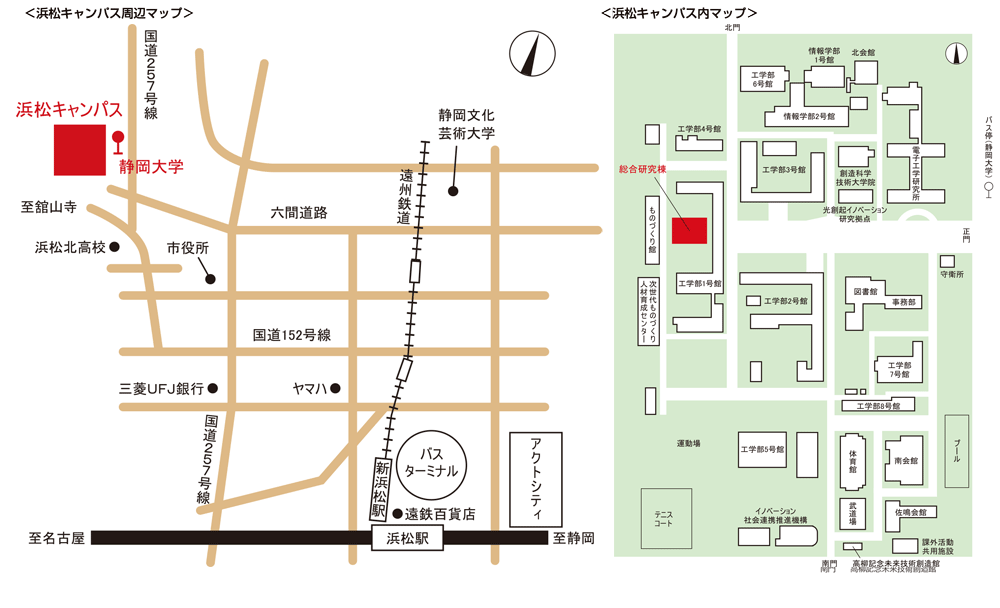 JR静岡駅北口しずてつジャストラインバス8番乗り場から、「静岡大学」または「東大谷」行きに乗車し、「静岡大学」または「静大片山」バス停下車(所要時間約25分、1時間に5~7本運行)。
