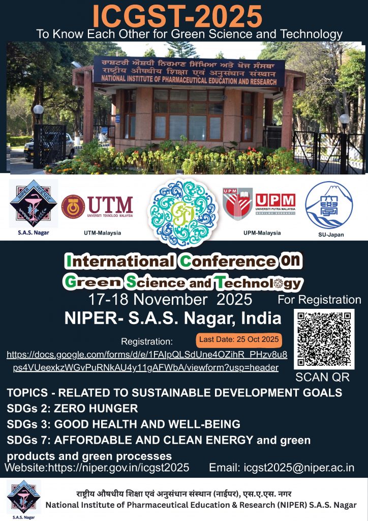The International Conference on Green Science and Technology 2025 (ICGST2025) will be jointly hosted by the National Institute of Pharmaceutical Education and Research (NIPER), India, Shizuoka University (SU), Japan, Universitas Gadjah Mada (UGM), Indonesia, Universiti Teknologi Malaysia (UTM), and Universiti Putra Malaysia (UPM).