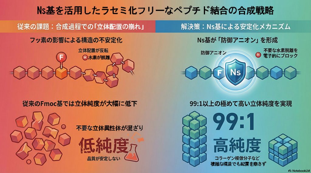 本研究では、N末端保護基として2-ニトロベンゼンスルホニル(Ns)基を導入することで、塩基条件下でスルホンアミドアニオンを優先的に形成させ、α脱プロトン化を抑制することに成功しました。