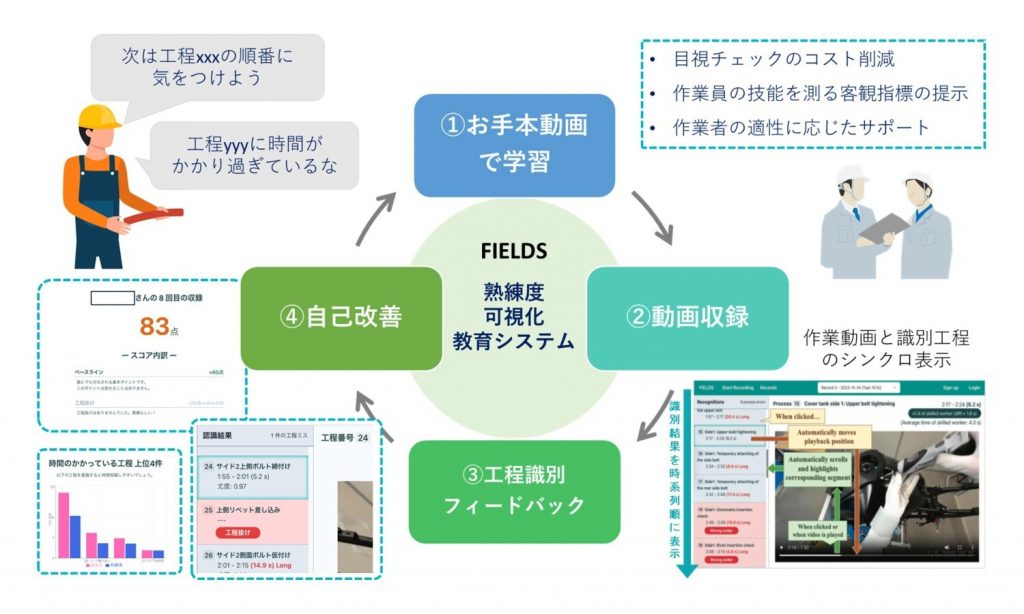 FIELDSは、工程抜けや工程順序の乱れ、作業時間超過といった作業の熟練度をフィードバックすることができ、実証実験の結果、AIによる機械フィードバックが作業者の熟練度認識を高め、作業改善を促進することを確認しました。AIモデルは熟練者の標準作業動作を学習して構築しており、製造現場の人材育成におけるAI活用の新しい可能性を示しています。現在、実環境下での試験導入を進めており、より実用的なシステム構築を目指しています。
