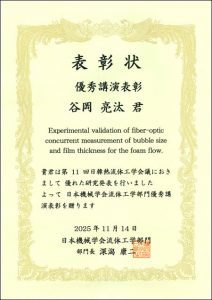 谷岡 亮汰さん(工学専攻 機械工学コース/水嶋研究室)が、第11回日韓機械学会合同・熱流体国際会議/The Eleventh JSME-KSME Thermal and Fluids Engineering Conferenceにおいて「優秀講演表彰」を受賞しました。